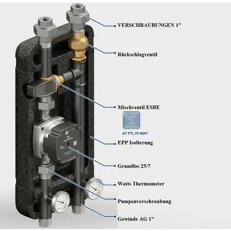 – Pumpengruppe ausgestattet in alle notwendigen Bestandteile- Rüchschlagventil, 1″ Verschraubung, Thermometer und alles in einer hochwertigen Isolierung.